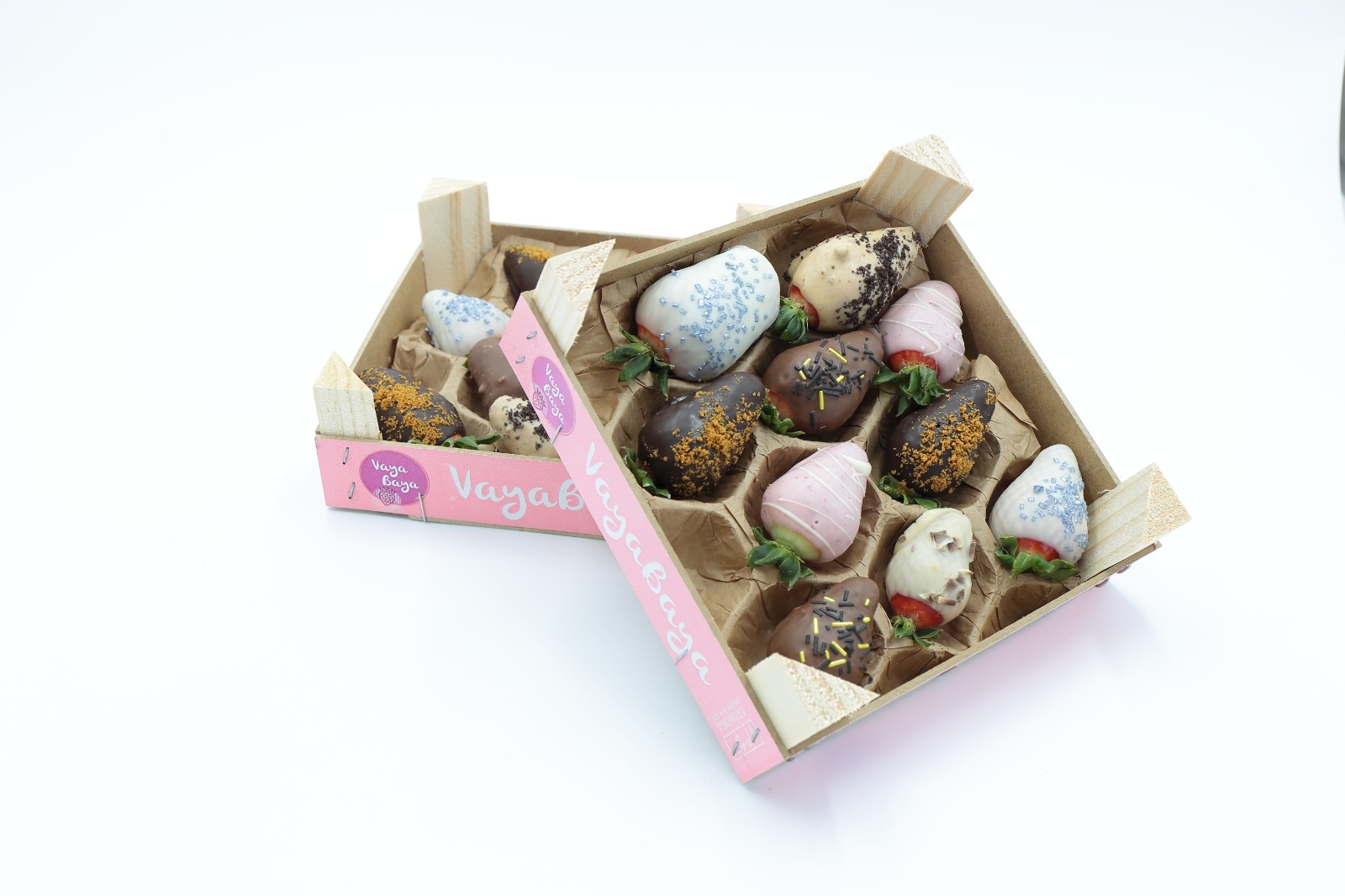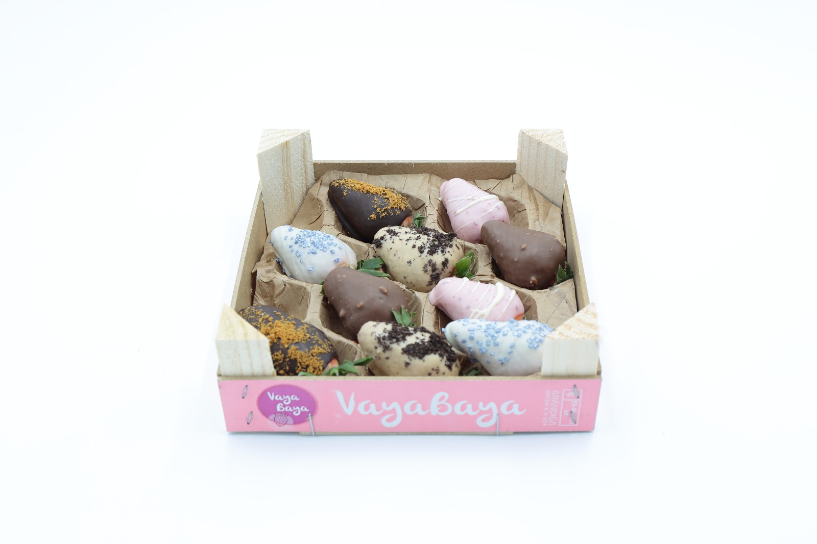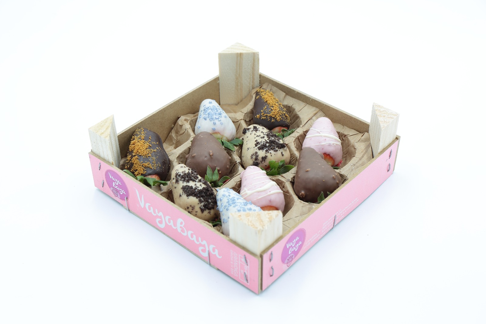 Caja con 10 fresas bañadas en chocolate, 11 euros.